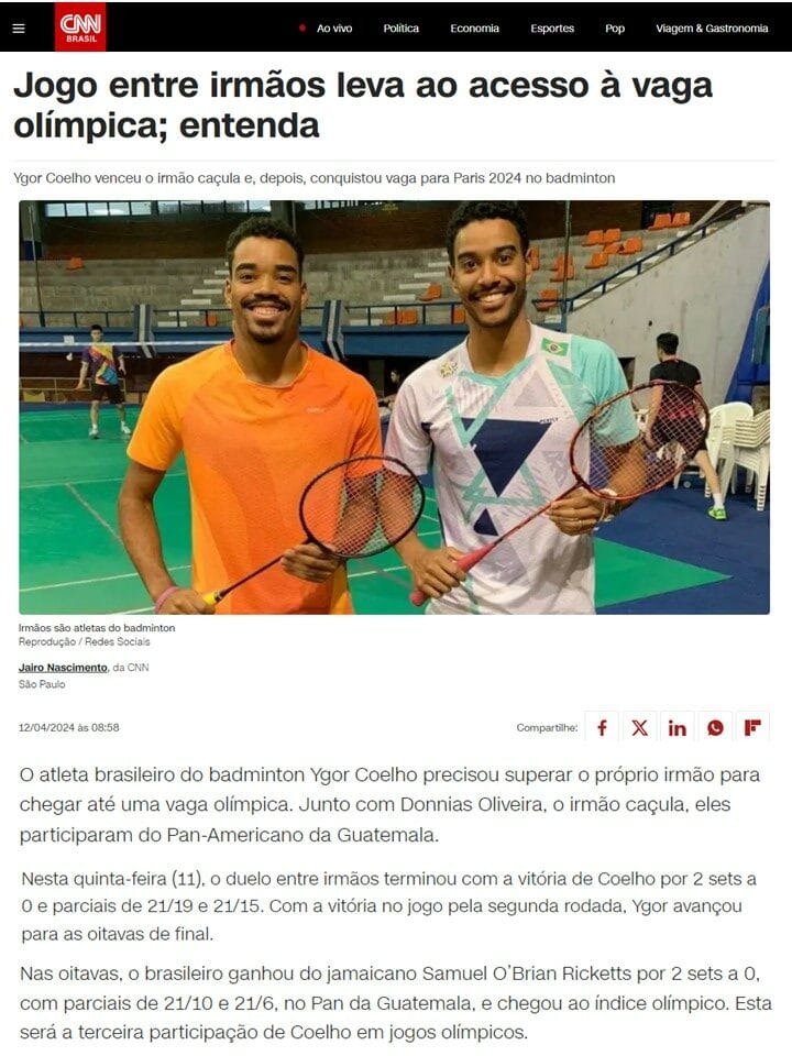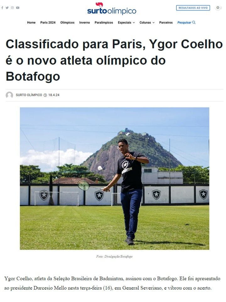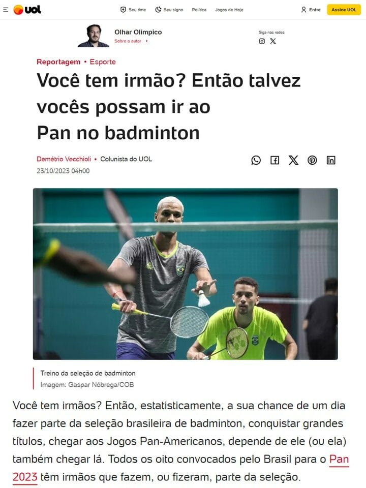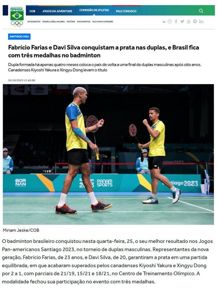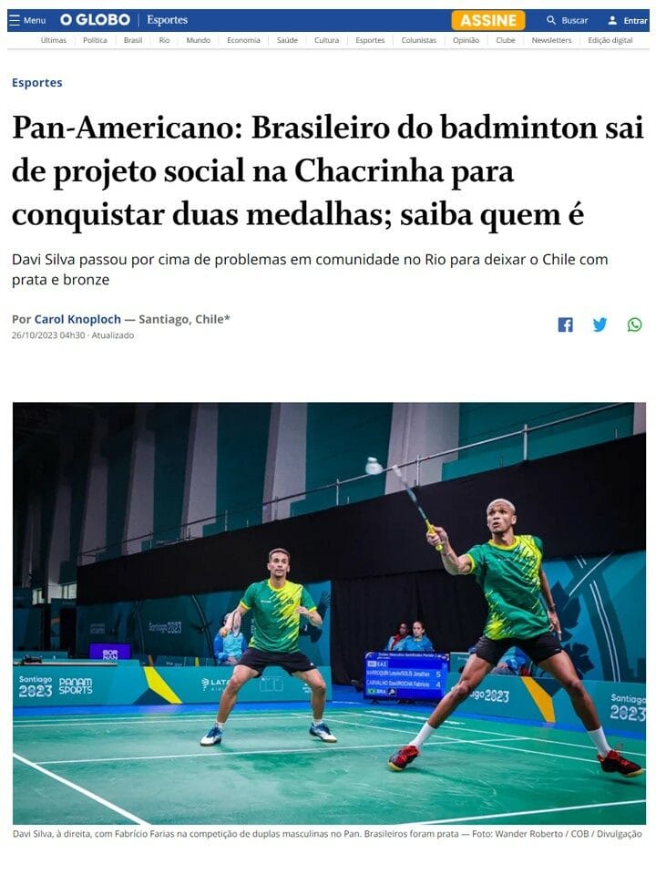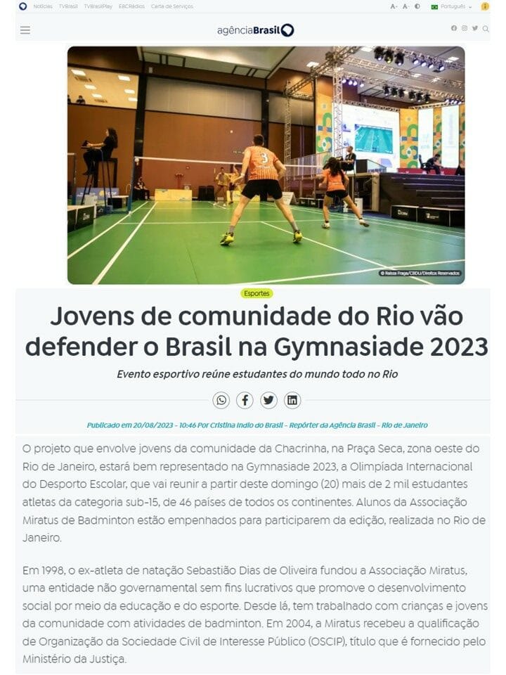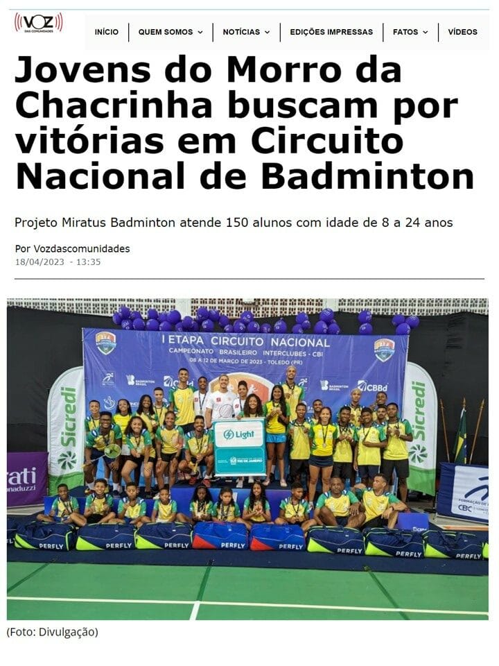 MateriasVeja a seguir matérias publicadas sobre a Associação Miratus e seus atletas. 2024 04 18 Surto Olimpico... 2024 04 16 Terra... 2024 04 12 CNN Brasil... 2023 10 26 O Globo... 2023 10 25 COB... 2023 10 23 Uol... 2023 08 20 Agencia Brasil... 2023 08 20 BWF BADMINTON (EN)... 2023 07 13 BWF Badminton (EN)... 2023 07 06 Blog Lu Lacerda... 2023 04 18 Voz da Comunidade... 2022 12 26 GLOBO ESPORTE...Pagination ← 1 2 3 4 … 21 →