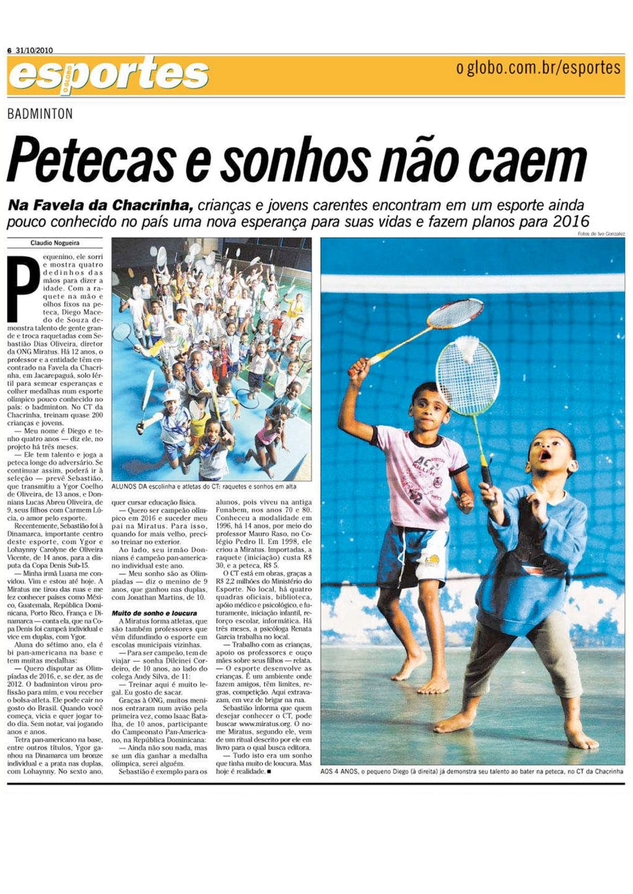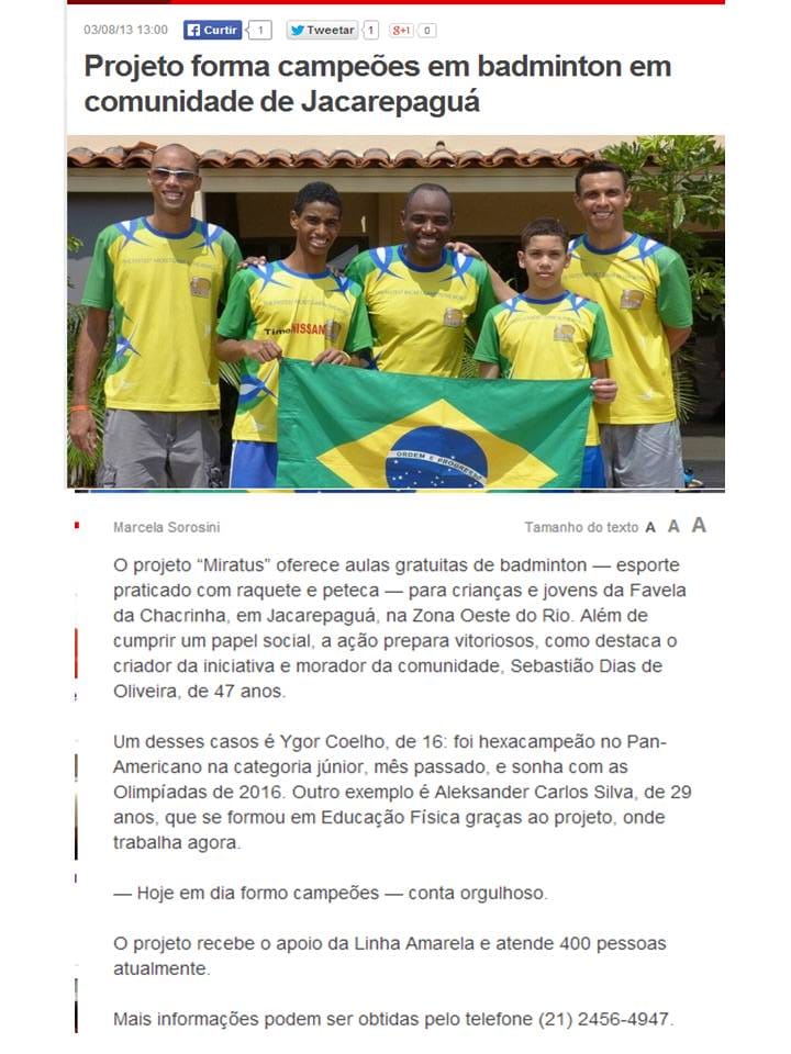 MateriasVeja a seguir matérias publicadas sobre a Associação Miratus e seus atletas. 2014 10 02 GloboEsporte com... 2014 08 25 BWF... 2014 08 18 COB... 2014 03 29 GSHOW... 2013 10 06 Extra Globo.com 2013 10 03 CBBd 2013 09 30 CBBd 2013 08 03 Extra Globo.com 2013 07 30 O Globo... 2011 07 03 O Dia... 2010 10 31 Miratus Globo 2009 01 31 Folha da Cidade...Pagination ← 1 … 17 18 19 20 21 →